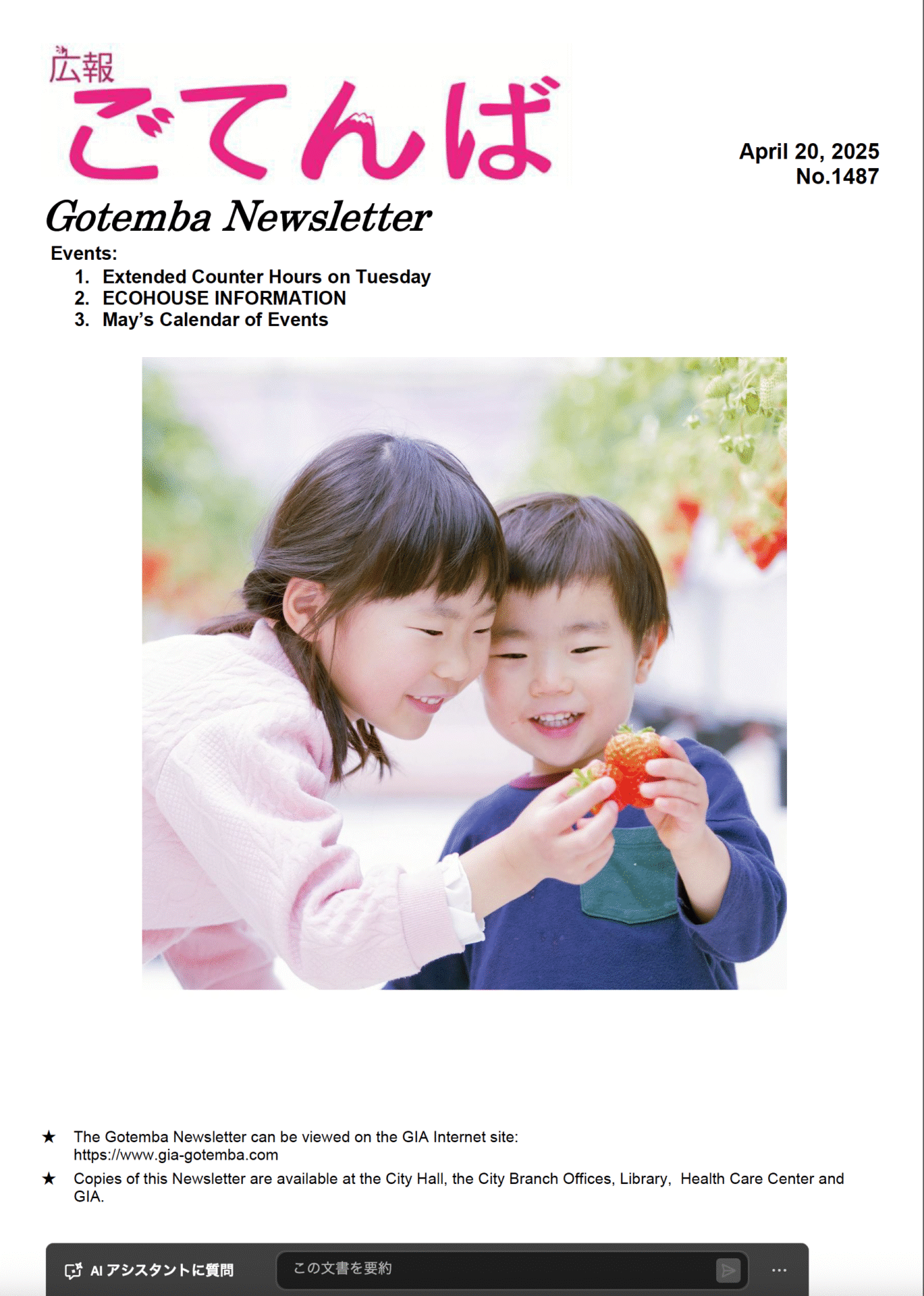 Public Information of Gotemba No.1487 Posted on 2025年4月22日2025年4月22日 by G-news [ source:GOTEMBA INTERNATIONAL ASSOCIATION ] At GIA, with the cooperation of translation volunteers, we translated excerpts from publicity booklet “Koho Gotemba” published by Gotemba City. Please see it by all means. ■Versão em português ■English ver. ■中文版 more info. GOTEMBA INTERNATIONAL ASSOCIATION こちらも人気です。 Public Information of Gotemba No.1489 Public Information of Gotemba No.1490 Public Information of Gotemba No.1486 ホストファミリー募集しています。