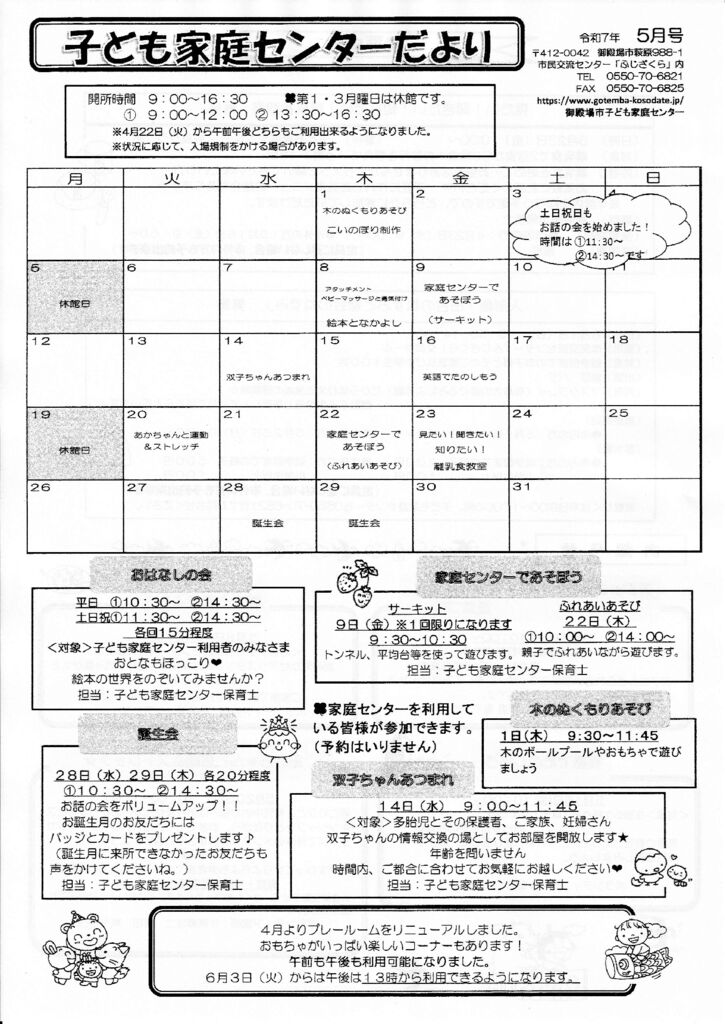 令和7年度子育て支援センター・支援事業の情報誌「みんなあつまれ」配布開始します。 子ども家庭センターでの事業をはじめ、市内の公私立保育所・こども園・幼稚園においての様々な事業、また、市内各地域の実情に応じた子育て支援とし […]
