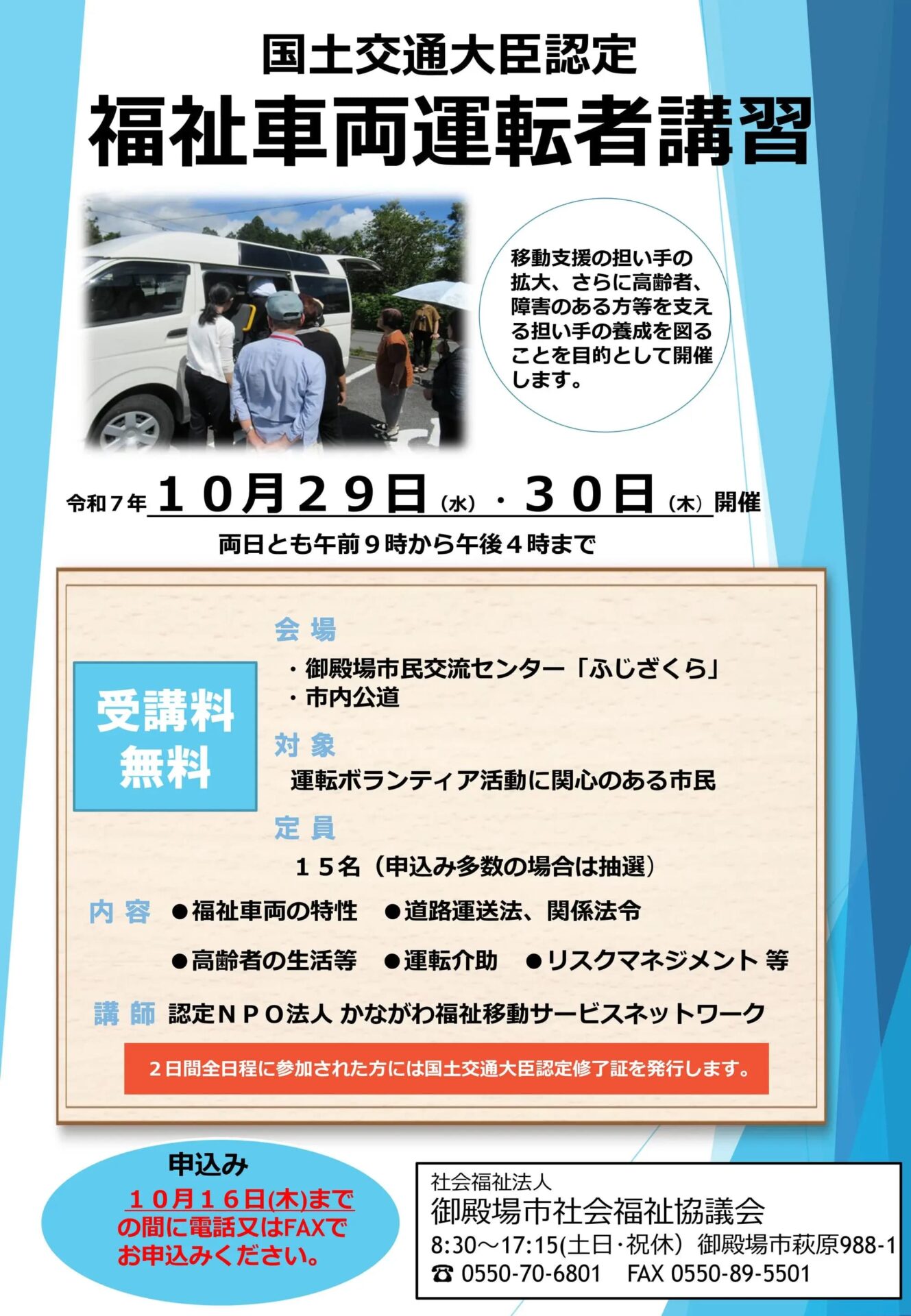 「福祉車両運転者講習」受講者募集のお知らせ Posted on 2025年10月7日 by G-news 市民交流センター「ふじざくら」と市内公道で、国土交通大臣認定「福祉車両運転者講習」を開催します。 開催日時 10月29日(水)と 10月30日(木)の2日間 午前9時から午後4時まで 内容 福祉車両運転者向け「安全運転研修」で座学と実習を行います。 全日程を修了した方には、国土交通大臣認定修了証を授与いたします。 対象 地域の外出支援や運転ボランティア活動に関心のある市民の方 募集人数 15人(申し込み多数の場合は抽選) 詳細はコチラ 御殿場市 こちらも人気です。 有償ボランティア「あったかサポート」支援員養成講座受講者募集のお知らせ 新御殿場市立図書館の愛称が「ほんてらす」に決定しました 新市立図書館のロゴマークを募集します! 御殿場市民交流センター職員を募集しています。