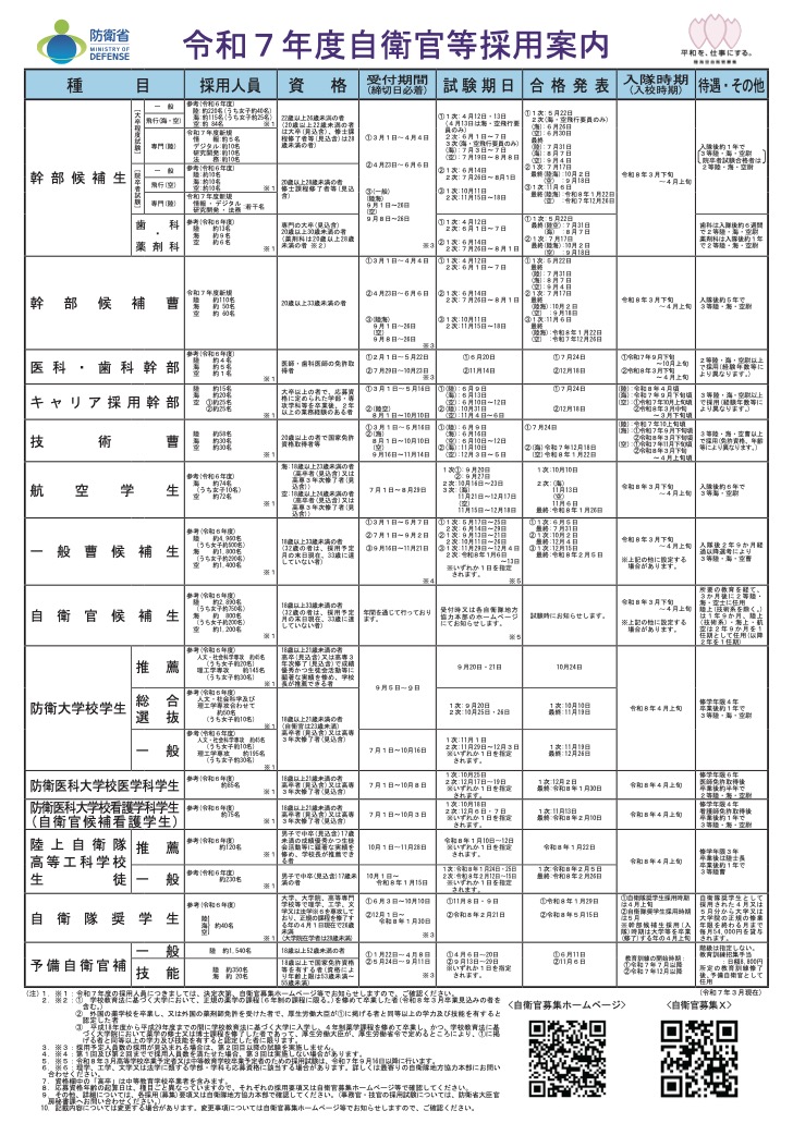 令和7年度自衛官等募集案内 Posted on 2025年3月25日 by G-news [ source:御殿場市役所 ] 自衛隊では、自衛官を募集しています。 令和7年度の採用スケジュールも掲載されています。詳しくは自衛隊募集ホームページをご覧ください。 詳細はコチラ 御殿場市役所 こちらも人気です。 御殿場市消費生活センター 新御殿場市立図書館の愛称を募集します 消防団女性部の募集 【パスポート申請】令和7年3月24日の申請受理分から「2025年旅券」の発給が始まります。