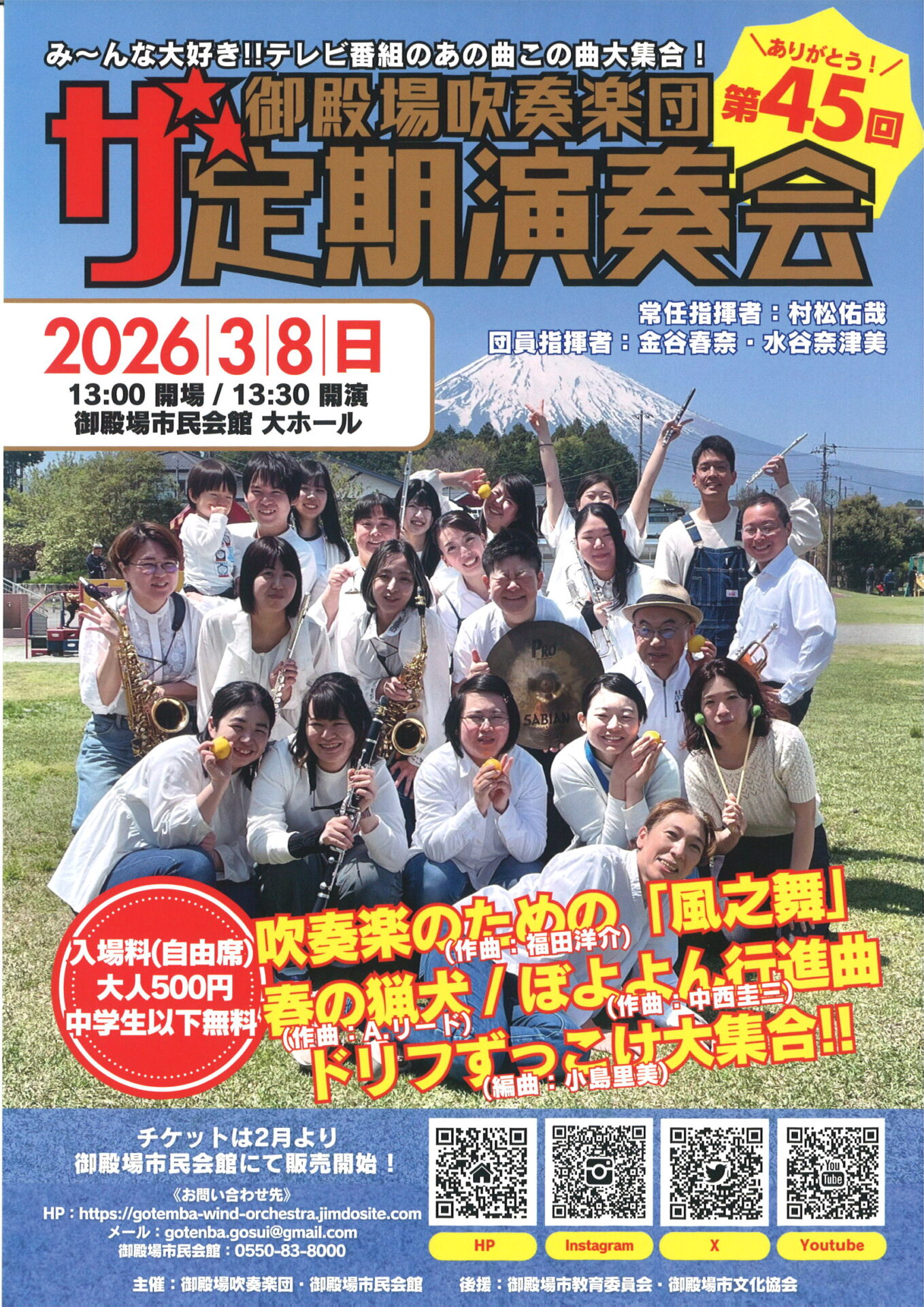 第45回 御殿場吹奏楽団 定期演奏会 御殿場吹奏楽団がお届けする、年に一度の定期演奏会。 第45回となる今回は、テレビでおなじみの名曲から本格吹奏楽作品まで、 世代を超えて楽しめるプログラムをご用意しました。 プログラム […]