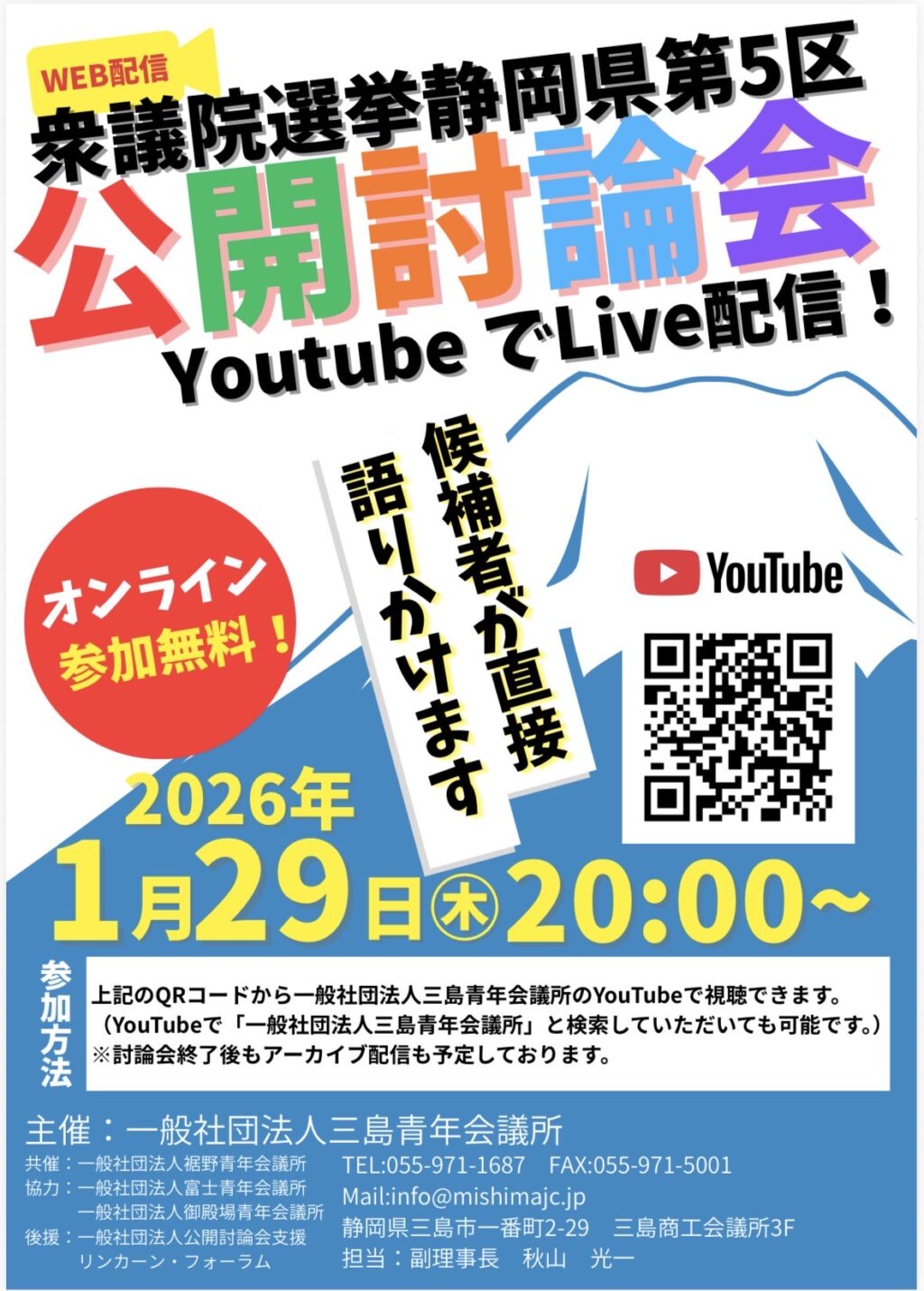 📢 衆議院選挙 静岡県第5区 公開討論会 開催のお知らせ 一般社団法人 御殿場青年会議所では、衆議院議員総選挙に向けた 「静岡県第5区 公開討論会」を開催いたします。 本討論会は YouTubeライブ配信 にて実施され、 […]