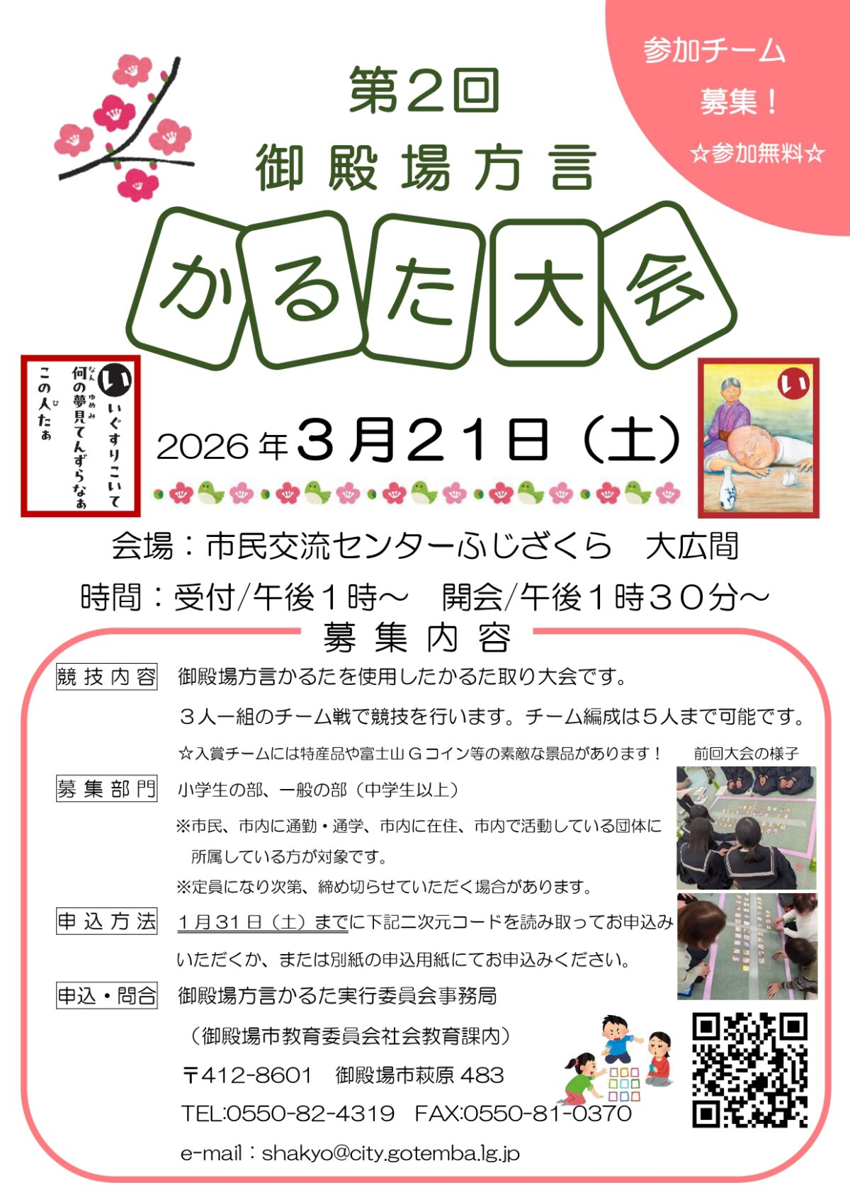 第2回御殿場方言かるた大会を開催します。 各部門ごと3人一組のチームで対戦し、入賞チームには御殿場市の特産品や富士山Gコインなどの素敵な賞品があります。奮ってご参加ください! 詳細はコチラ 御殿場市