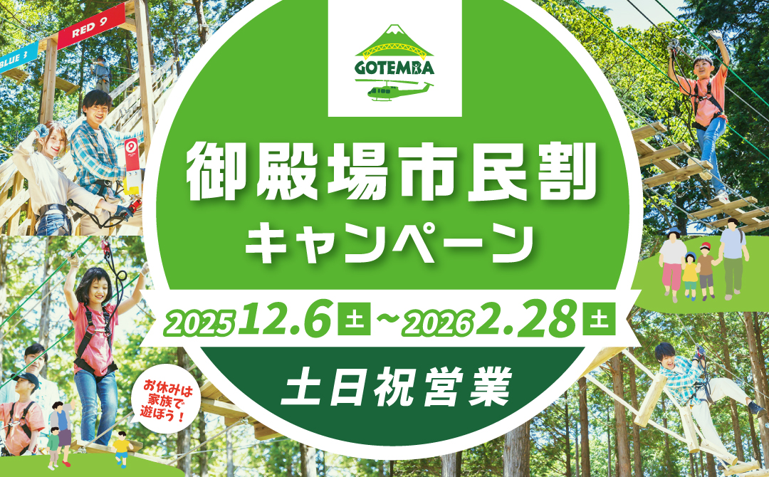 市民割キャンペーンを開始! 受付の際に、御殿場市民在住であることがわかる証明書をご提示いただくと、とってもお得に本格アスレチックが楽しめます。 詳細はコチラ フォレストアドベンチャー・御殿場