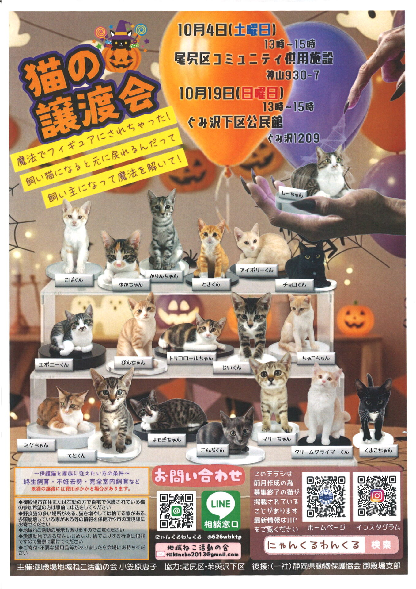 10月4日(土) 13時~15時 尾尻区コミュニティ供用施設(神山930-7) 10月19日(日) 13時~15時 ぐみ沢下区公民館(茱萸沢1209) ~保護猫を家族に迎えたい方の条件~ 終生飼育・不妊去勢・完全室内飼育 […]