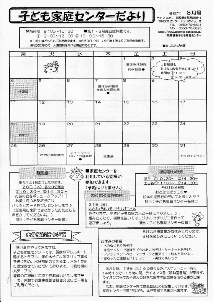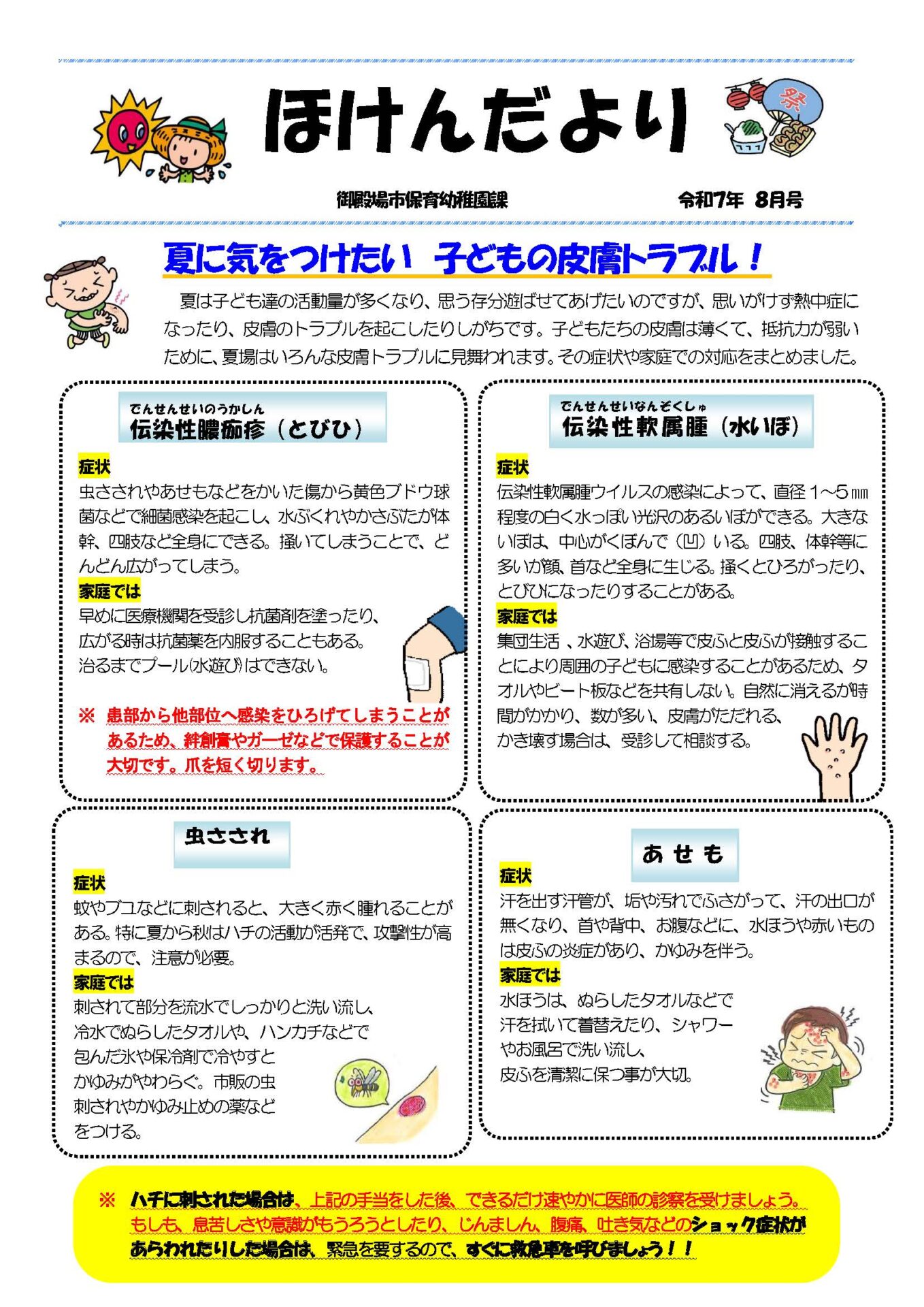 8月号 ほけんだよりの内容 ・夏に気をつけたい 子どもの皮膚トラブル! ・8月7日は鼻の日 気をつけたい 鼻にまつわる症状 ・引き続き熱中症に注意しましょう! ・9月の乳幼児健診・相談 詳細はコチラ 子育て支援サイト