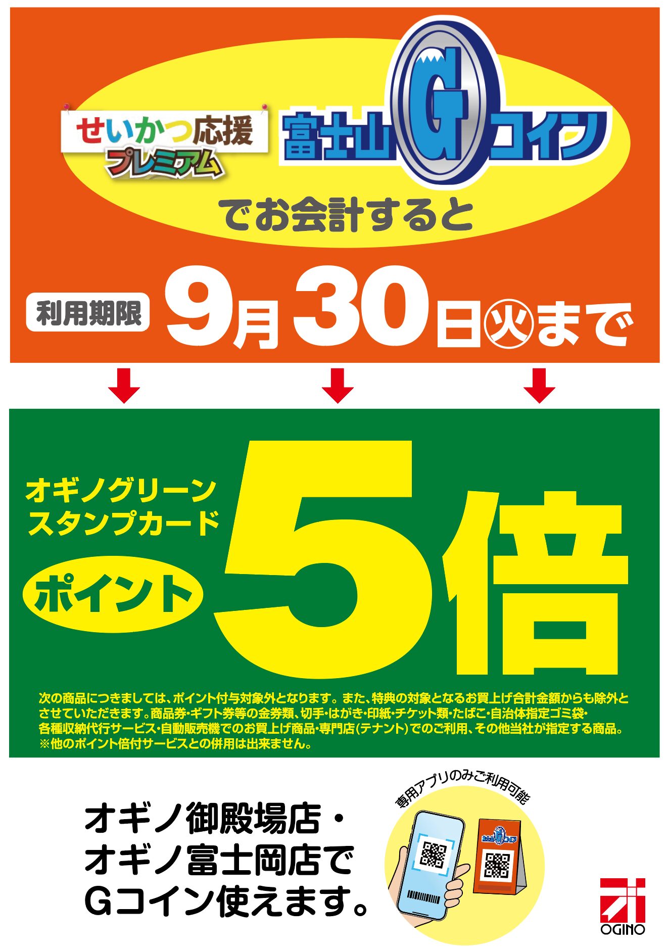 オギノ御殿場店・富士岡店では期間中、富士山Gコインでお会計をするとオギノグリーンスタンプカードポイント5倍! 詳細はコチラ 富士山Gコイン