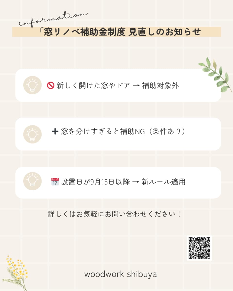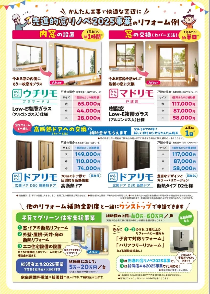 2025年9月15日以降に設置される外窓・ドアについて、補助対象の条件が一部変更されます。 💡主な変更点は以下の3つです: ① 新たに開口を作る工事は補助対象外 ➡ 新設・拡張・位置変更などが含まれます。 ※ただし、増築 […]