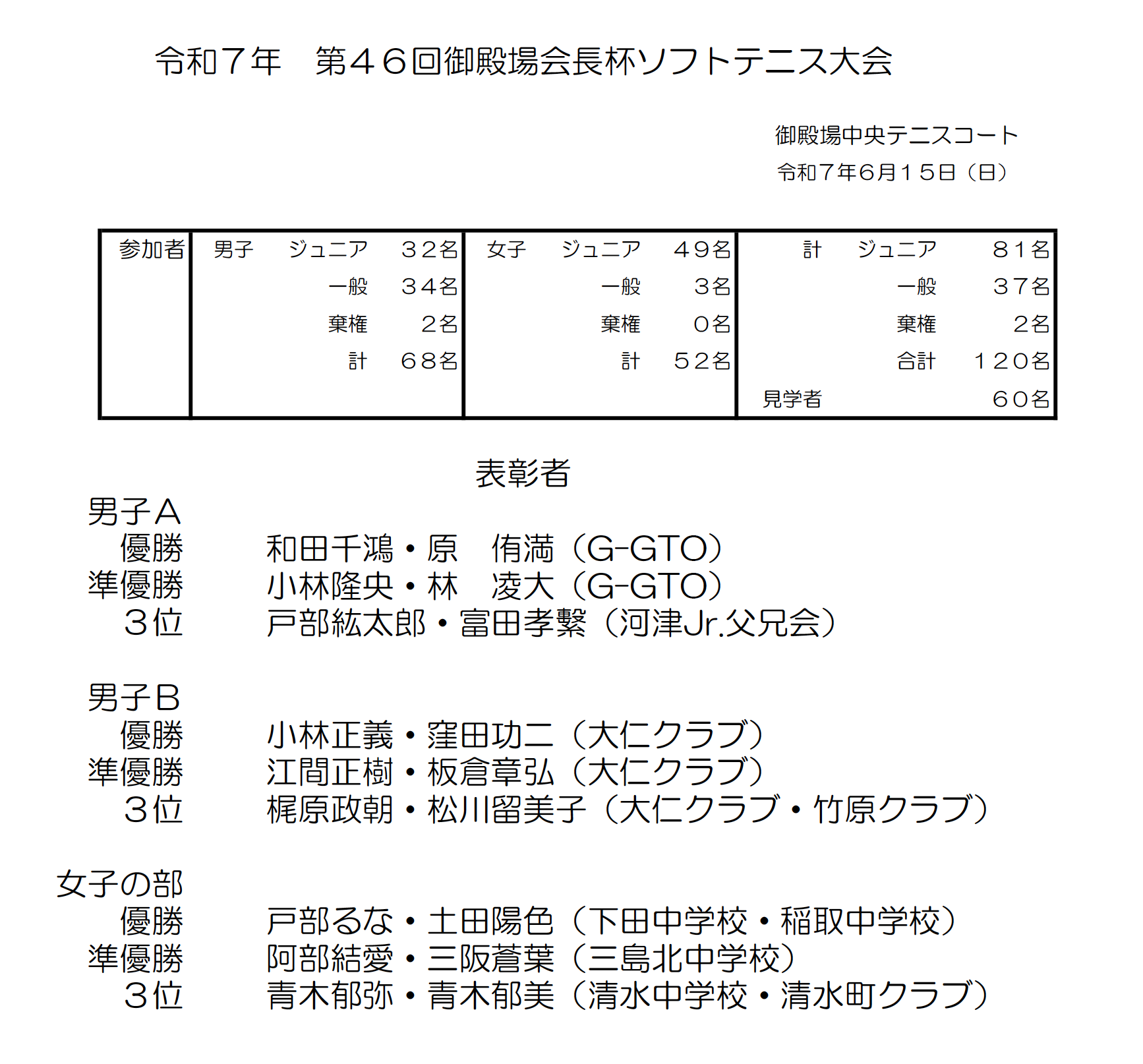 ソフトテニス連盟主催の令和7年度第46回御殿場会長杯ソフトテニス大会が6月15日(日)に中央テニスコートで開催されました。大会結果は次のとおりです。 詳細はコチラ 御殿場市スポーツ協会