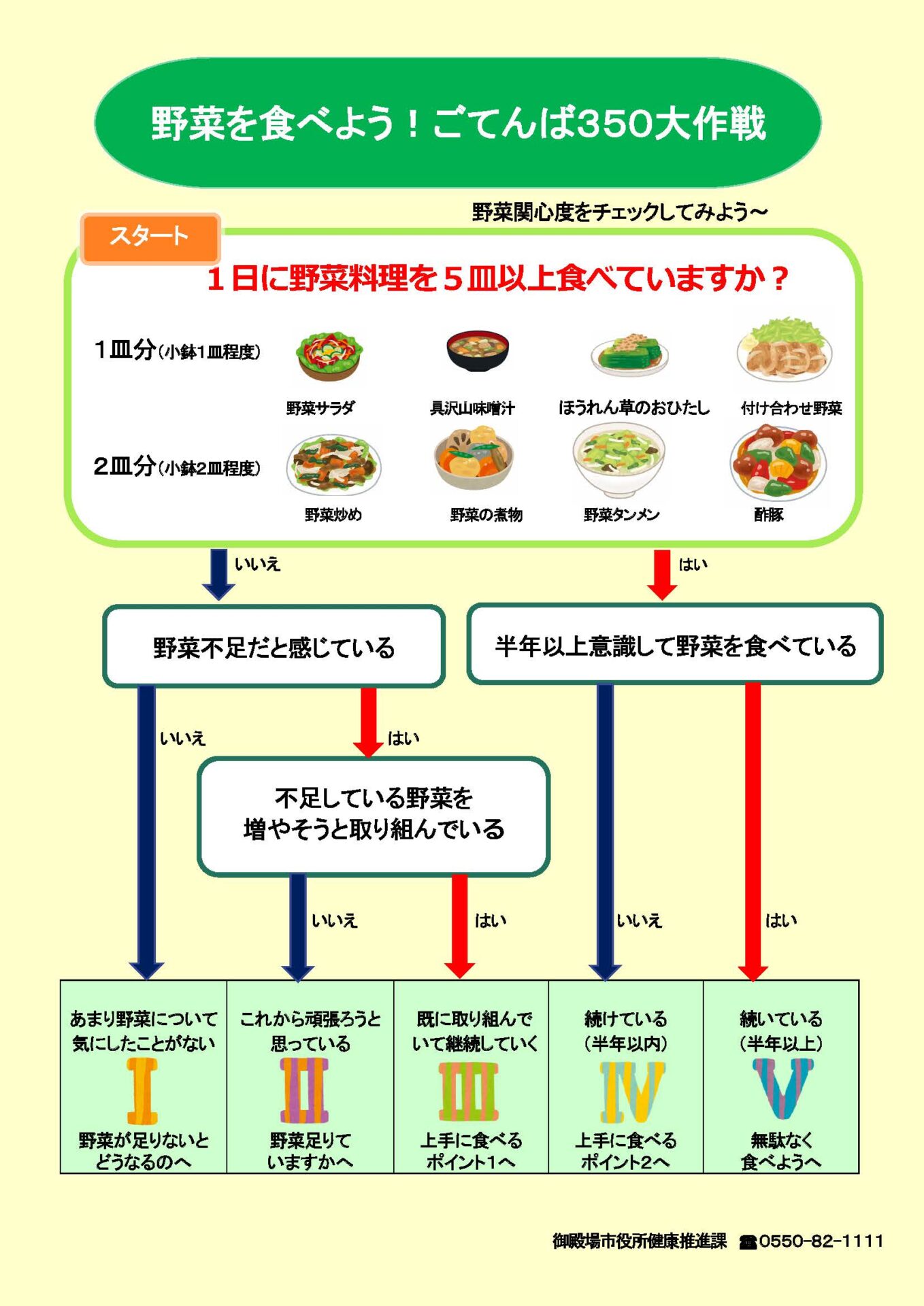 生活習慣病予防・改善に向けて「野菜摂取量の不足」にターゲットを絞り、リーフレットを作成しました。 表紙のチェックリストを使用し、あなたの野菜の関心度をチェックしてみましょう。 詳細はコチラ 御殿場市