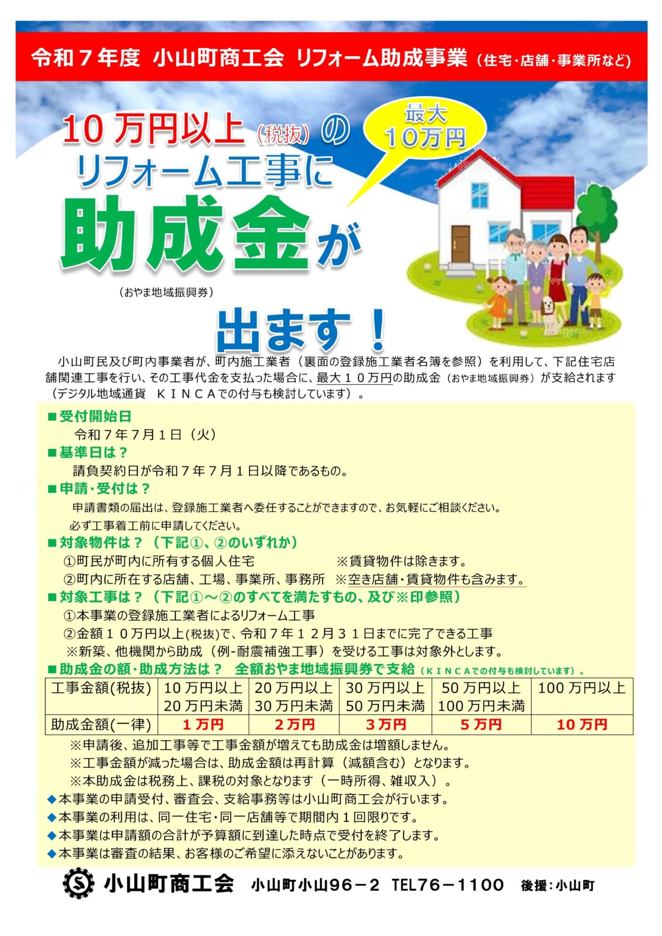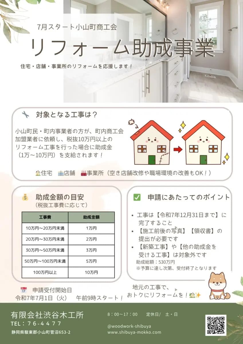 住宅・店舗・事業所のリフォームをご検討中の皆さまへ✨ 小山町民や町内事業者の方が、小山町商工会加盟業者に依頼し、10万円以上のリフォーム工事を行うと、最大10万円の助成金が受け取れます! 【対象工事】 住宅・店舗・事業所 […]