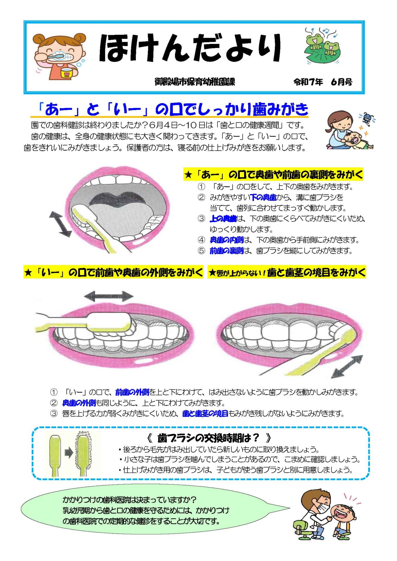 6月号 ほけんだよりの内容 「あー」と「いー」の口でしっかり歯みがき! 歯の健康は、全身の健康状態にも大きく関わってきます。「あー」と「いー」の口で、歯をきれいにみがきましょう。保護者の方は、寝る前の仕上げみがきをお願い […]