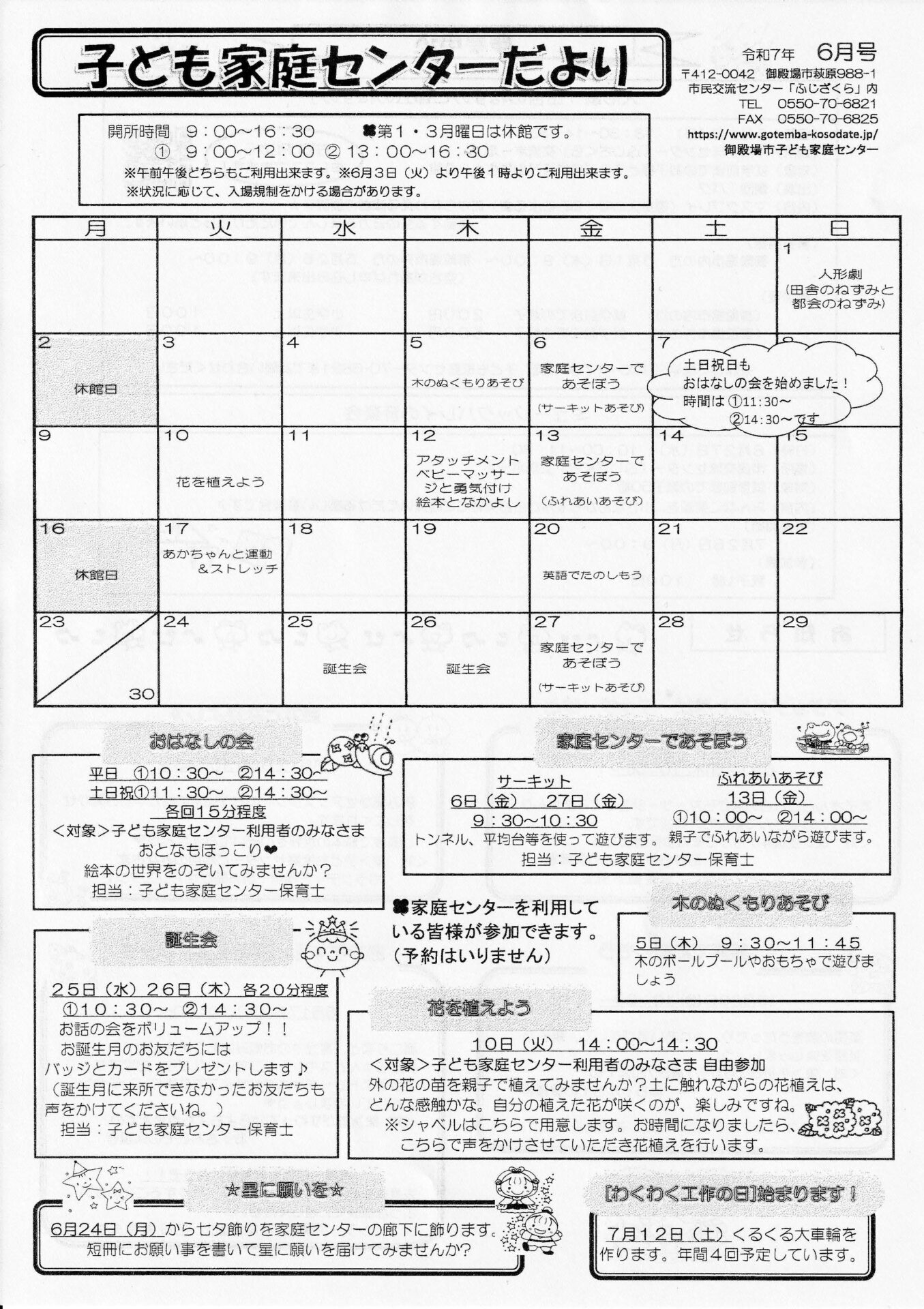 子ども家庭センターより 開所時間 9:00~16:30 ①9:00~12:00 ②13:00~16:30 ※6月3日(火)より午後のご利用が13時からとなります。 午前・午後もご利用できます。(12:00~13:00の間 […]