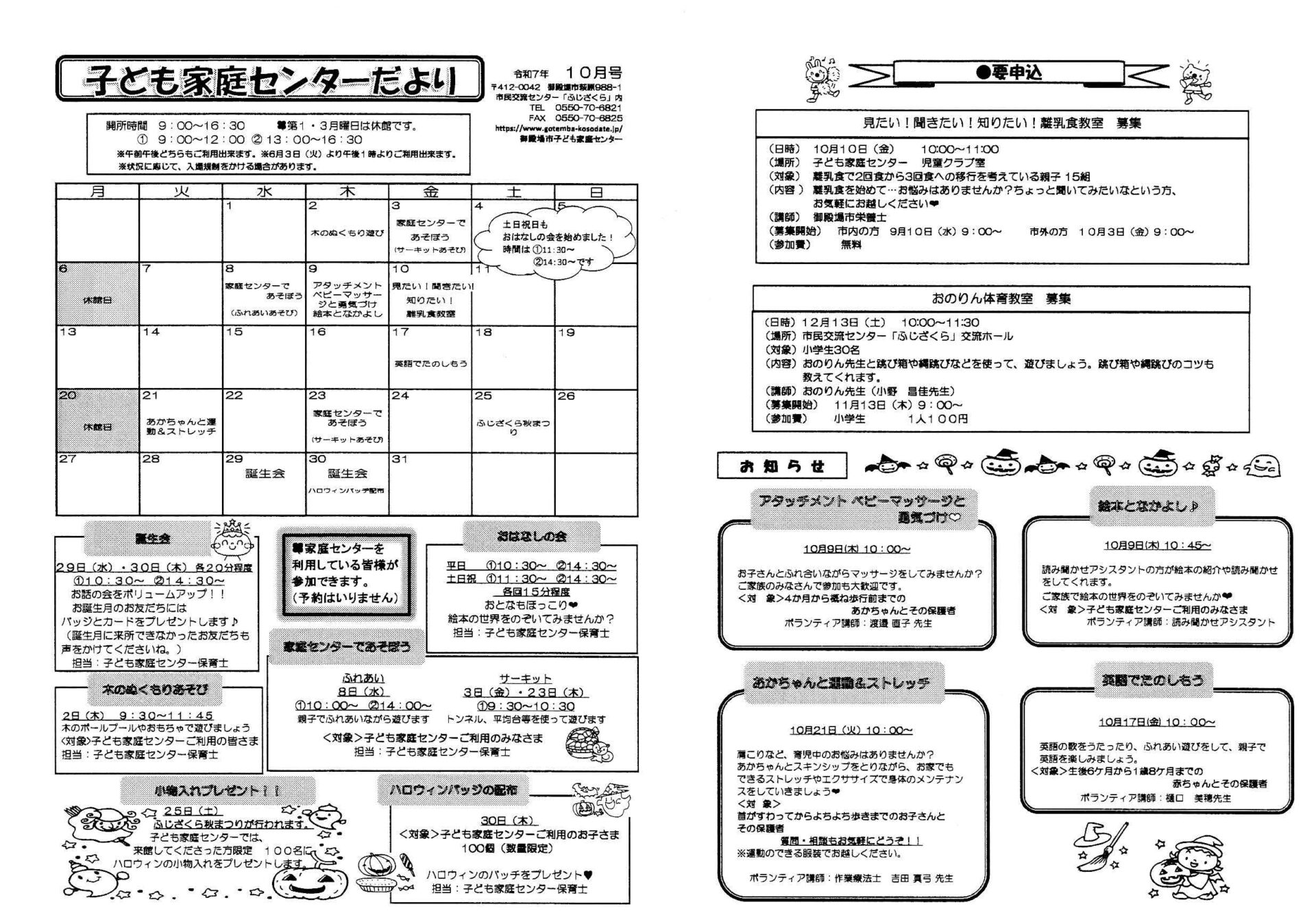ふれあいプール玉穂の10月のお知らせです。 ①休館日のお知らせ 毎週水曜日休館 ②無料送迎バス運行のお知らせ 4月~11月の間無料送迎バスを運行しております。 土・日・祝日のみ 御殿場駅発 10:00、13:00 […]