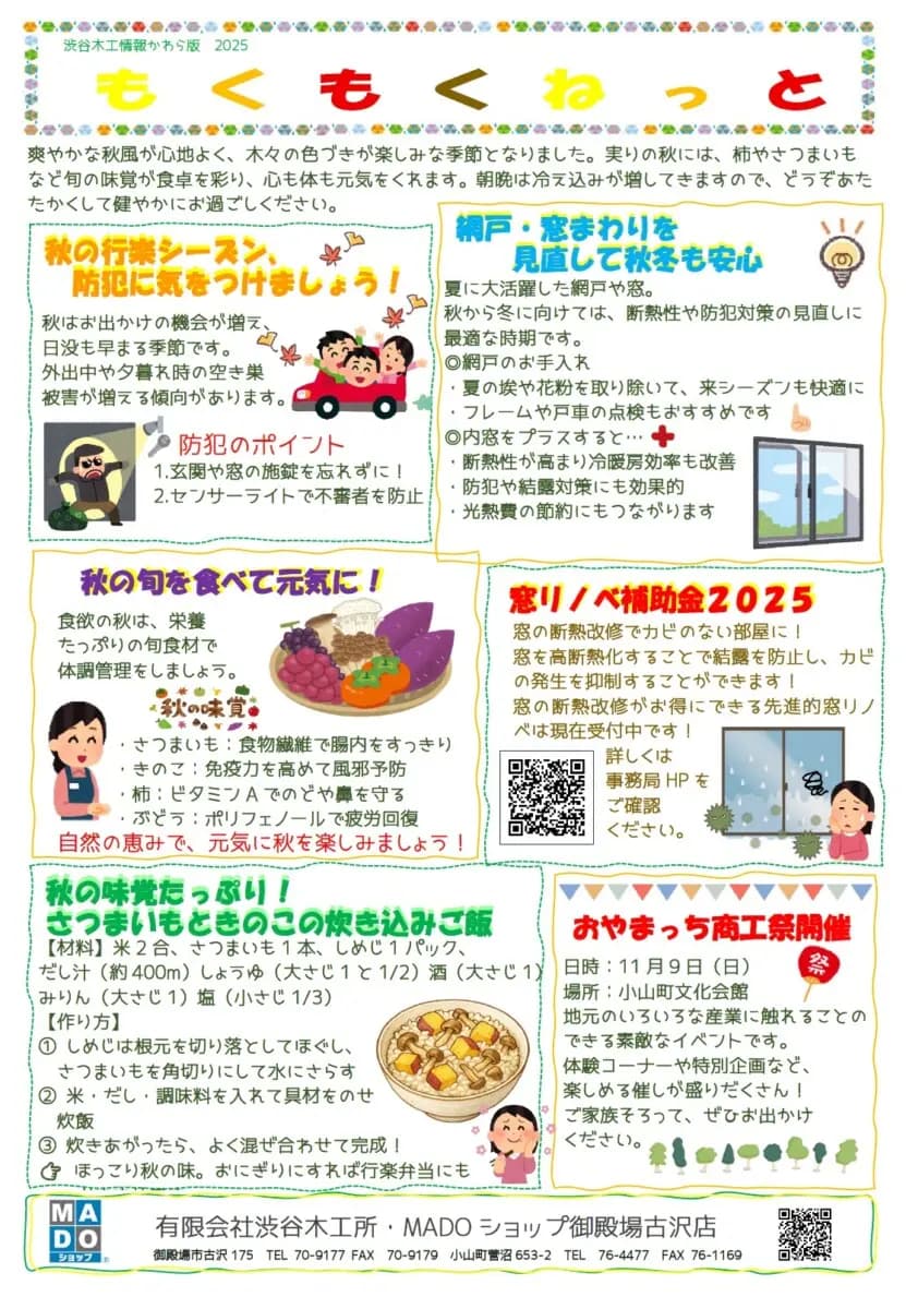 🍁「もくもくねっと」10月号ができました!🍁 爽やかな秋風が心地よい季節となりましたね。 今月号では、秋の行楽シーズンに気をつけたい防犯のポイントや、網戸・窓まわりの見直しのすすめ、旬の味覚を楽しむレシピなどを紹介してい […]