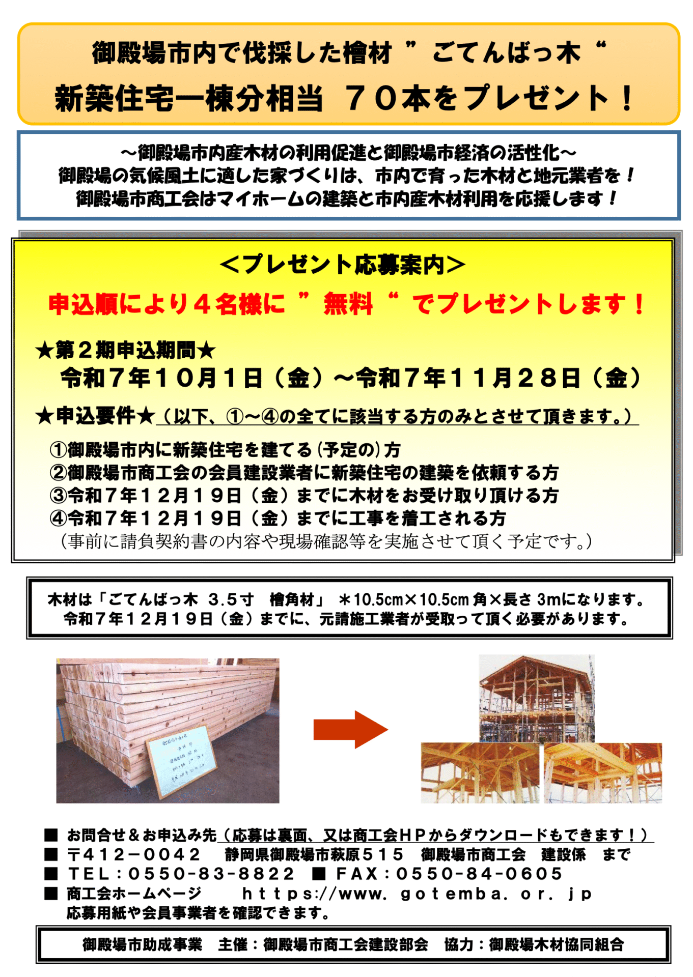 御殿場市内に新築住宅を建設される方へ新築住宅1棟分相当の檜柱(ごてんばっ木、3.5角材)を70本プレゼントします! 御殿場市商工会建設部会ではマイホーム建築を応援するため、今年も檜柱70本プレゼントを実施します。御殿場市 […]