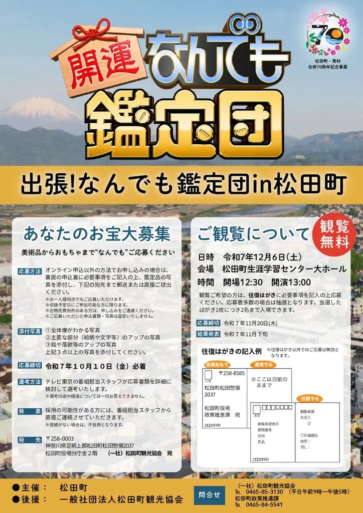 長寿テレビ番組「開運 なんでも鑑定団」のご当地出張鑑定企画「出張!なんでも鑑定団in松田町」の公開収録を開催します。 この機会にとっておきの「お宝」を鑑定してもらいませんか。時代、ジャンルは問いません。美術品から、お菓子 […]