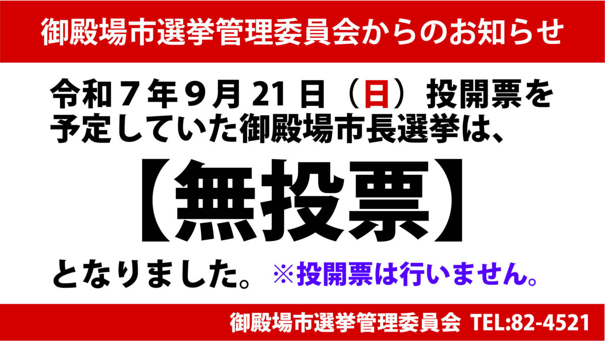 令和7年9月21日執行の御殿場市長選挙は、届出のあった候補者が1名であったため、公職選挙法第100第4項の規定により、無投票になりました。 詳細はコチラ 御殿場市