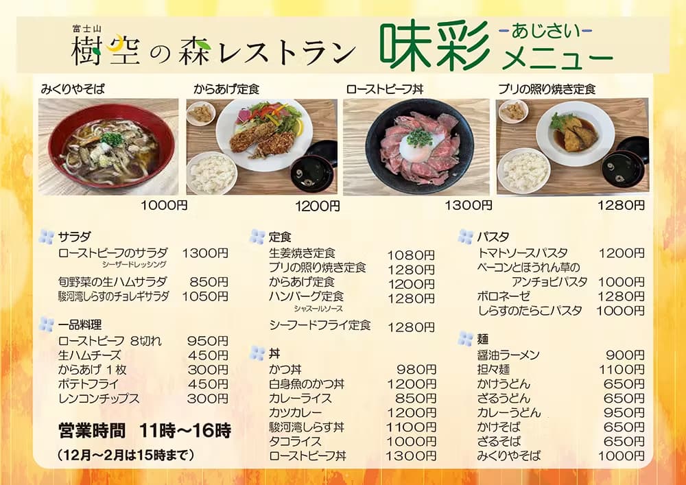 富士山樹空の森レストランが新しいお店になりました! 「樹空の森レストラン 味彩」 店主イチオシ、御殿場の野菜をたっぷり使った「御殿場みくりやそば」を堪能できます!! 営業時間:11:00から16:00(冬季は15:00ま […]