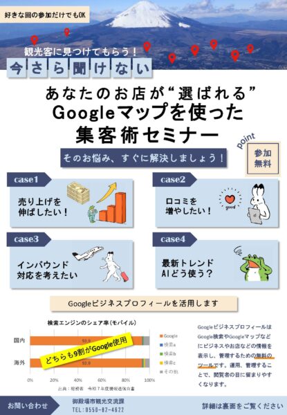 Googleビジネスプロフィールの管理・運用・分析方法をはじめとした、インターネット上での効果的な情報発信について学べるセミナーを開催します。 Googleビジネスプロフィールとは Google検索やGoogleマップで […]